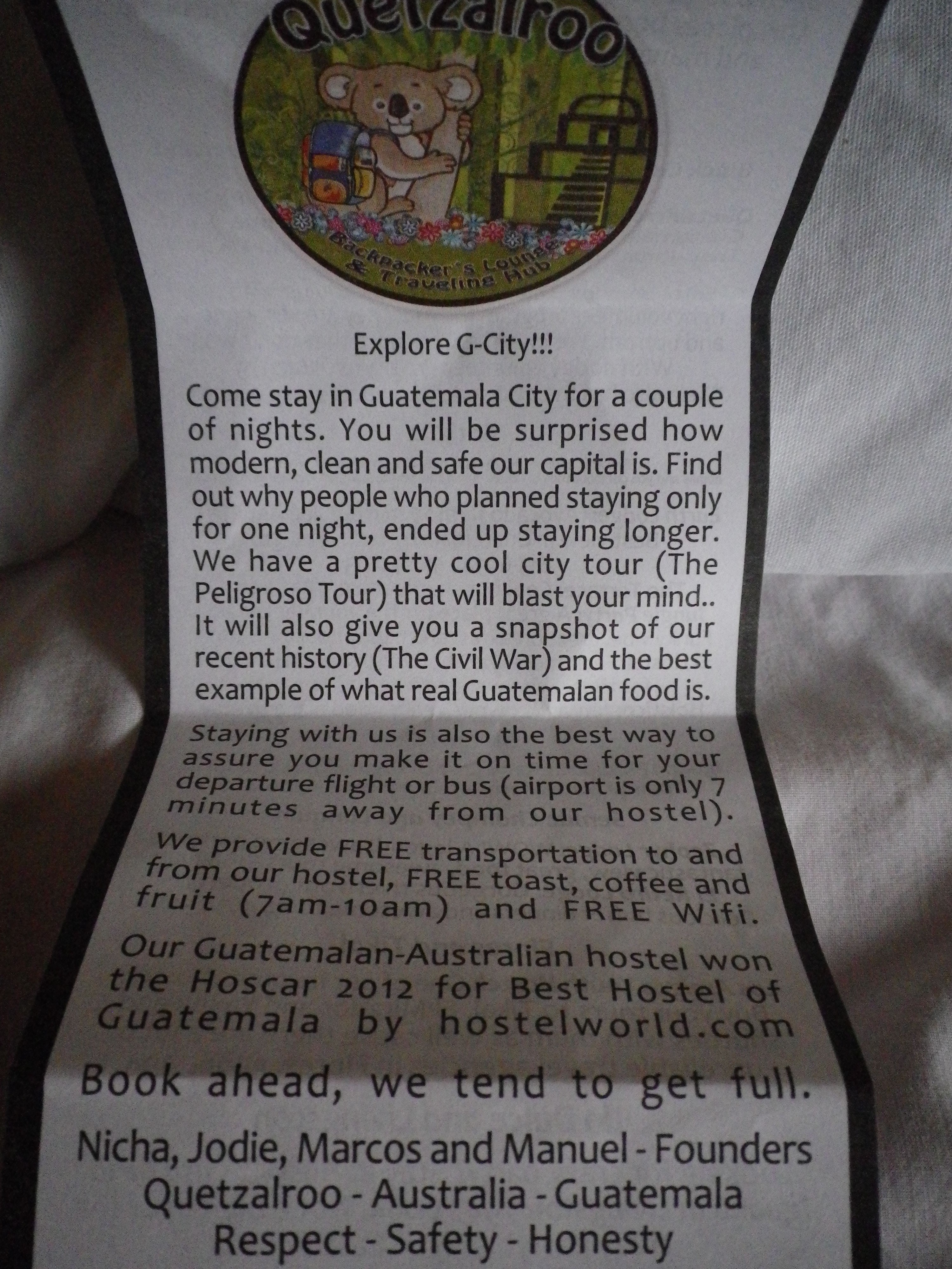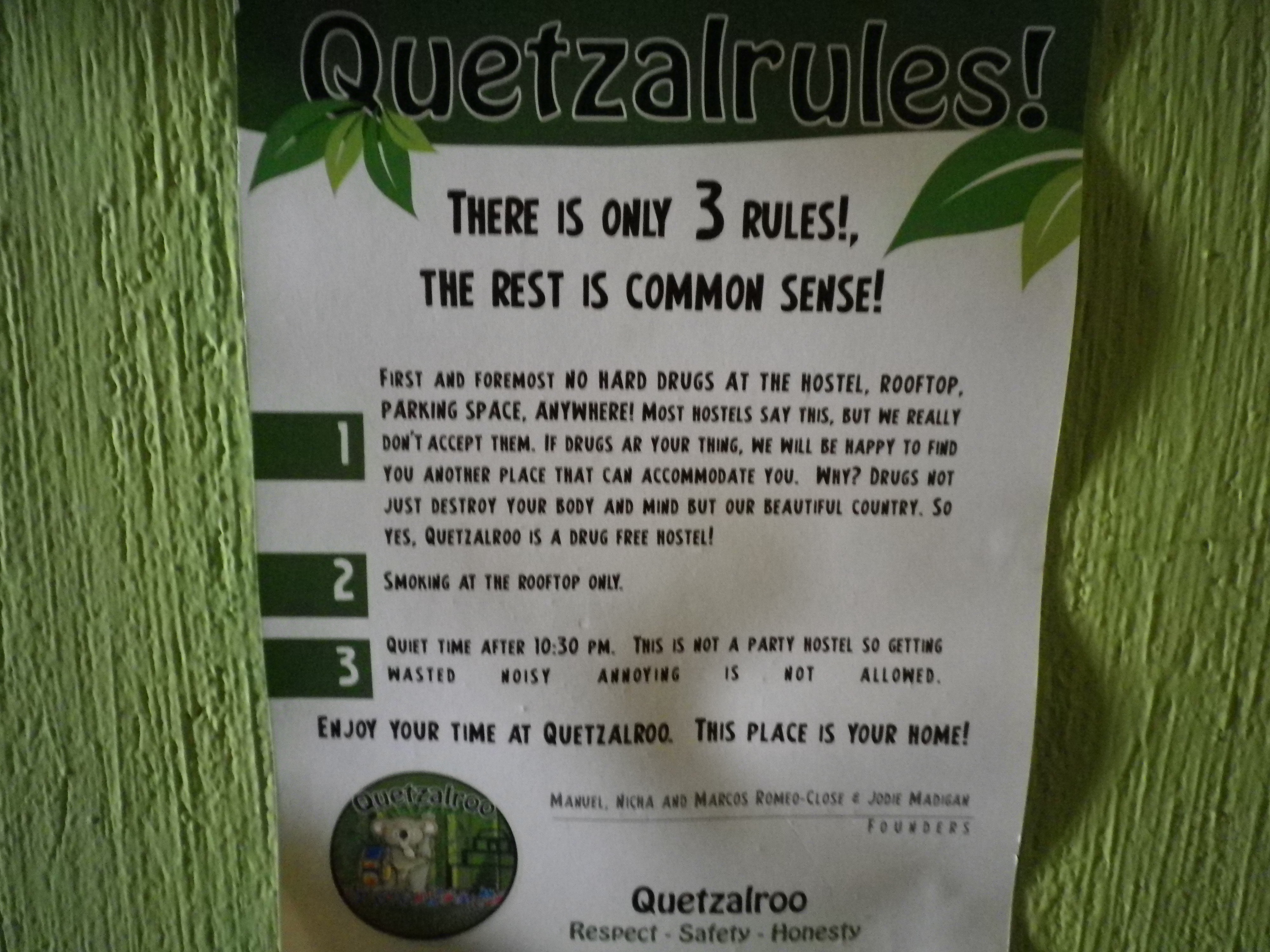 Quetzalroo Hostel (Guatemala City) Photos Posted on November 21, 2013 by admin Welcom to Quetzalroo transportation Check out more pictures of Quetzalroo… Enter here: Suite #6 Check in, dining area, computer Peanut lounging in the common room Private Room Another dorm room Simple. El Bano Share this with a friend:Click to share on Facebook (Opens in new window)Click to share on Twitter (Opens in new window)Click to email a link to a friend (Opens in new window)Click to share on Pinterest (Opens in new window)
