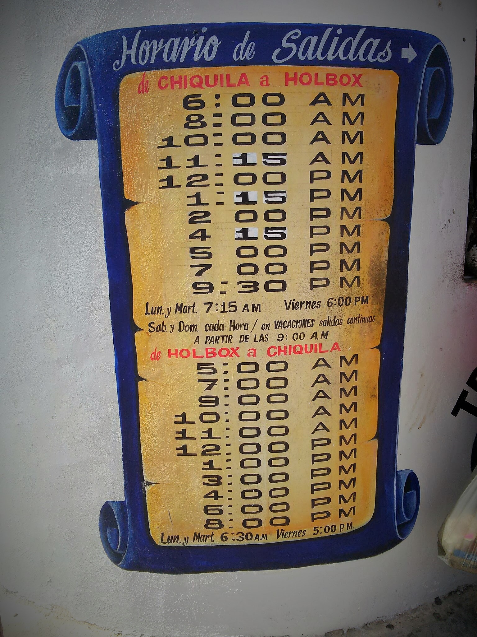 On the map it looks as though it should take 2 hours to get to Chiquila (the port town for Isla Holbox); in fact, it takes nearly double that – depending on the day of the week. Second class buses leave the Cancun bus station at 7:50 am and 12:40 pm daily and cost $80 pesos ($6.40 usd).