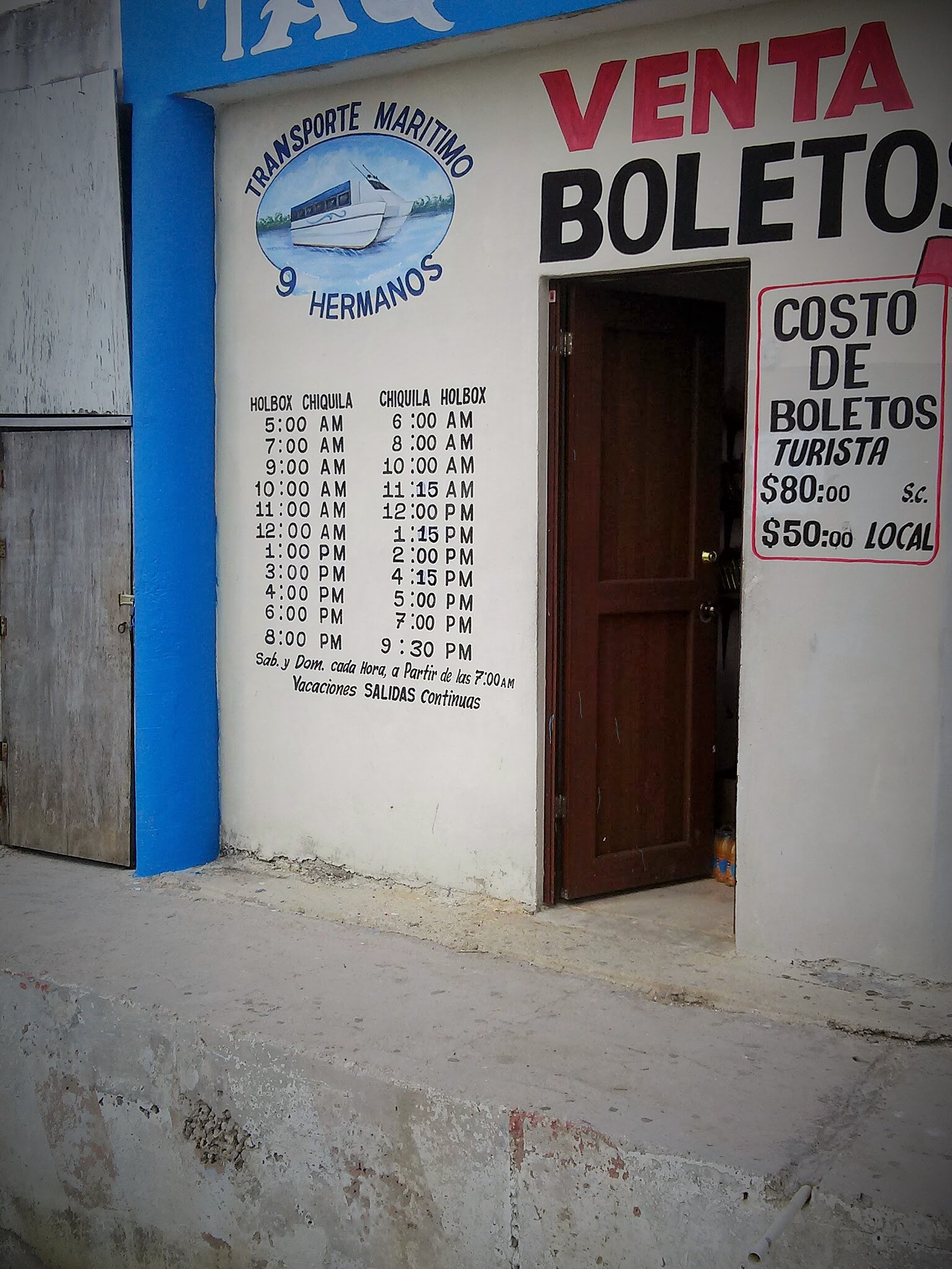 In Chiqiula: Buses will drop you off at the dock for the Ferry. Before you enter the dock you’ll see a ticket both. Here the price is P$90 for foreigners. If you head down the dock, there is another Ferry Company, 9 Hermanos, where tickets cost P$80. Basically, the Ferrys to Holbox run hourly, beginning at 6am and ending at 9:30pm. The exceptions are that there are no ferrys at 7am, 3pm, or 6pm.